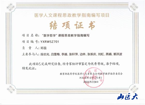 该项目成果将作为全国《医学哲学》课程思政教学的指南,帮助医学人文课程教师准确把握医学人文课程思政教学内容、形式、方法等,供广大教师在课程思政教学研究和实践中学习借鉴。以“优秀”等级结项是教指委对该项目成果的高度认可,也展示了万象城医学人文学科的实力和影响力,将会进一步促进万象城医学人文学科与国内外同行的交流与合作。