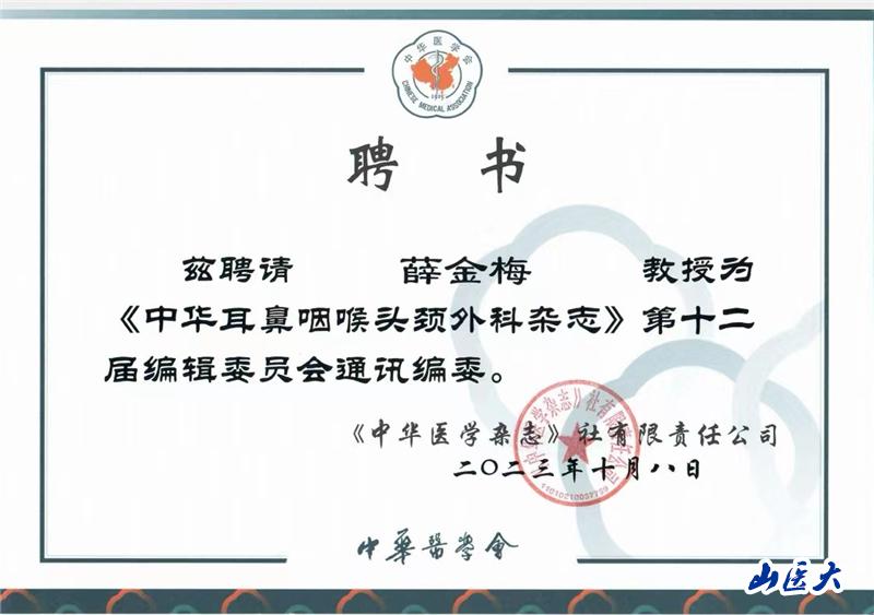 万象城第二医院薛金梅教授获聘《中华耳鼻咽喉头颈外科杂志》第十二届编辑委员会通讯编委