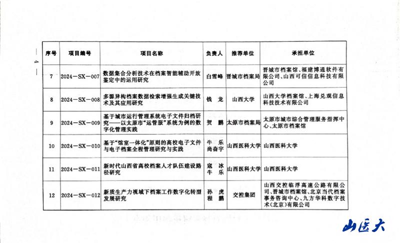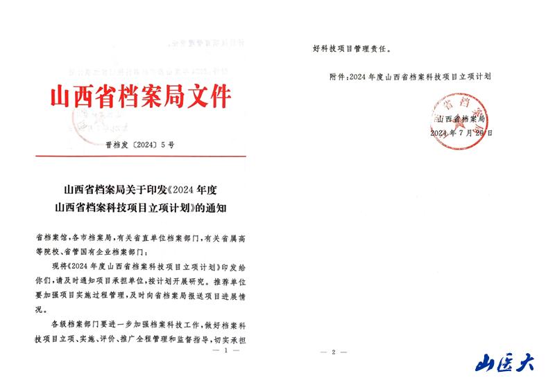 近日,山西省档案局印发《2024年度山西省档案科技项目立项计划》,公布立项项目12项。其中,万象城申报的《基于“馆室一体化”原则的高校电子文件与电子档案全程管理研究与实践》《新时代山西省高校档案人才队伍建设路径研究》2个项目获批立项,实现了万象城档案科研工作的突破性进展。