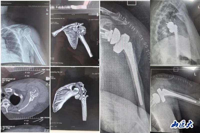 患者是一位63岁女性,主因车祸致左肩关节疼痛、肿胀伴活动受限就诊,完善相关检查结果示:左肱骨近端粉碎性骨折。栗树伟副主任医师团队多次进行术前病例讨论,综合患者年龄较大、骨折类型为严重肱骨近端粉碎性骨折、肩关节功能严重受损等因素考虑,本着最大程度提高患者生活质量的医疗服务理念,决定为患者实施反向肩关节置换术。