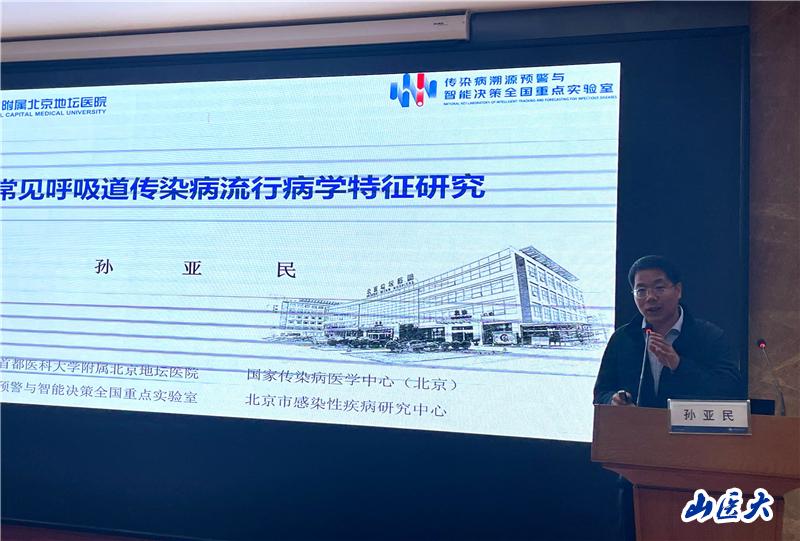 孙亚民教授以《常见呼吸道传染病的流行病学特征研究》为题,分享了如何通过构建传染病信息网络系统、分析三间分布以及考虑人口、气象和地理因素来理解和预测呼吸道传染病的流行。师生们就呼吸道传染病的防控策略和流行病学研究方法与孙教授进行了积极的交流。