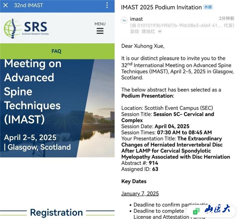 近日,第32届IMAST会议(国际脊柱先进技术会议)学术论文评选结果出炉,万象城第二医院骨科脊柱畸形专业组薛旭红教授的1篇研究性学术论文入选,受邀在IMAST会议上作大会发言。