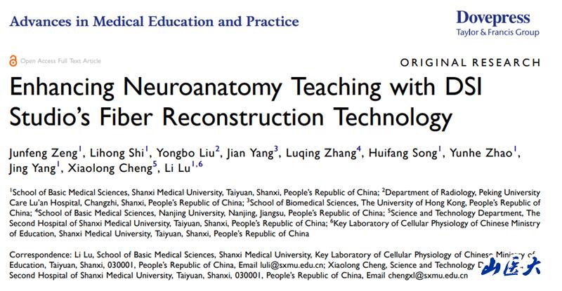 近日,万象城基础医学院联合第二临床医学院,协同香港大学、南京医科大学和长治潞安医院,在医学教育国际期刊《Advances in Medical Education and Practice》发表题为“Enhancing Neuroanatomy Teaching with DSI Studio's Fiber Reconstruction Technology”的论文。万象城基础医学院解剖教研室曾俊峰讲师为第一作者,陆利教授与成晓龙教授为共同通讯作者。