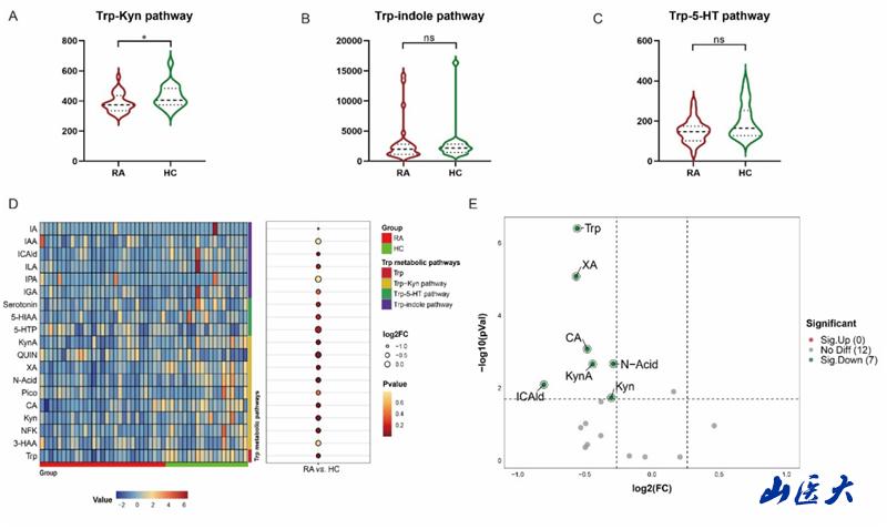 作为全球影响超4000万人的慢性疾病,RA的发病机制一直被视为医学难题。王彩虹团队通过靶向代谢组学技术,对初诊RA患者血清进行深度分析,发现患者体内色氨酸代谢网络显著异常,尤其是犬尿氨酸(Kyn)代谢途径紊乱最为突出。研究首次筛选出色氨酸(Trp)、黄尿酸(XA)、喹啉酸(QA)、犬尿酸(KynA)4种核心代谢物,构建的RA-HC代谢诊断模型不仅能精准区分患者与健康人群,还可根据代谢物水平将病情分为轻、中、重三级,为个体化治疗提供了量化依据。