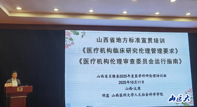 两项地方标准发布后,学校积极参与宣贯工作。在山西省2025年度医学科研伦理培训班上,邓蕊教授面向省内外200余位伦理委员会委员及医护人员对两项标准进行了解读,就临床科研工作者常遇到的伦理问题、伦理难题现场解答,进一步推进了我省医学科研伦理工作规范发展。