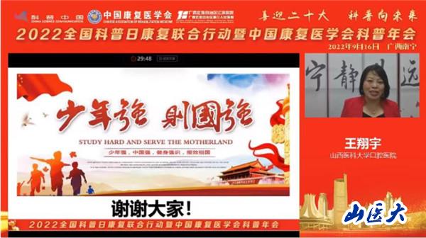 9月16日上午,由中国康复医学会主办的“中国康复医学会全国科普日联合行动暨康复科普年会与科技创新高峰论坛”在南宁召开。本次大会设立南宁主会场与线上云科普大讲堂,同步线上观看人数超7万人。在口腔疾病预防与康复分会场中,口腔医院王翔宇副院长作为山西省首位被遴选登上中国康复医学会科普舞台的演讲嘉宾,作了题为《青少年口腔保健》的科普演讲,详细介绍了青少年口腔健康的常见问题,博得了与会专家的热烈掌声。