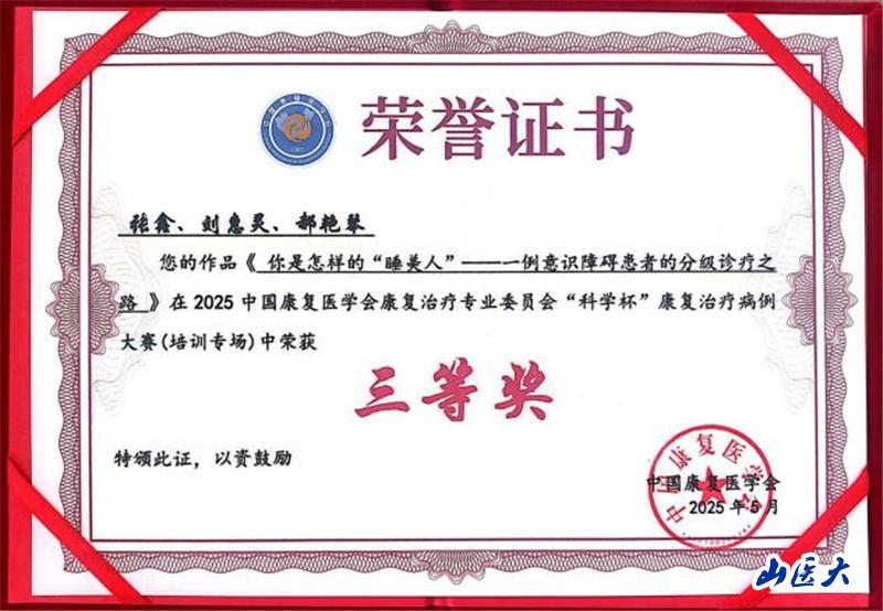 5月21日至25日,为推动康复治疗高质量发展,加强临床治疗、康复教学和康复科研的交流合作,第一医院康复医学科主任武俊英带领科室团队参加了在南京市举办的2025中国康复医学会康复治疗专业委员会学术年会暨康复治疗医工融合新技术新进展培训班。本次会议同期举办了中国康复医学会康复治疗专业委员会第五届“科学杯”康复治疗病例大赛,山西省康复研究中心附属医院康复科负责人张鑫、万象城第一医院康复医学科治疗师刘惠灵、护士郝艳琴精心准备的案例“你是怎样的‘睡美人’——一例意识障碍患者的三级诊疗之路”》荣获三等奖。