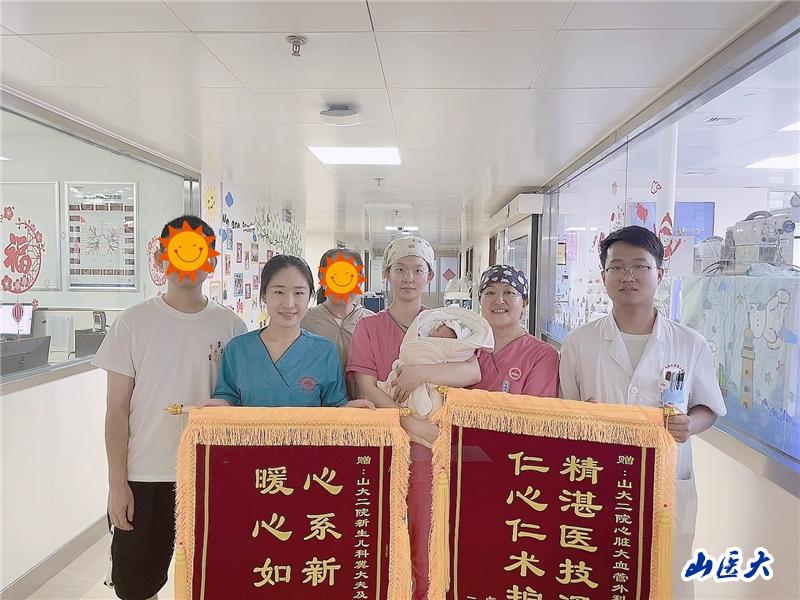 转入后,婴儿出现了进行性加重的呼吸困难,考虑新生儿为急性呼吸窘迫综合征(ARDS)。王晓林主任带领的新生儿科医护团队先后对小患者予以无创、有创呼吸机辅助呼吸,气管插管内补充PS、抗感染等对症支持。次日早晨约9点左右,患儿在有创呼吸机辅助呼吸下经皮氧饱和度不能维持、左侧胸廓饱满,考虑气胸可能。紧急胸片提示左侧气胸、纵膈右移,新生儿科医师给予小患者胸腔穿刺抽气、呼吸机改高频模式、患侧卧位,呼吸机氧浓度及压力下调等治疗措施。2小时后,小患儿再次出现氧需求上升,急查胸片见大量气胸,左肺压缩1/3。新生儿科紧急联系心脏大血管外科张斌医师,为其行胸腔闭式引流。置管48小时后,顺利拔除闭式引流管;有创呼吸机使用4天后,顺利拔除气管插管;至患儿出生后10天顺利离氧;生后13天,这位坚强的小“汉子”随父母回家。家属为表示感谢,特意为新生儿科全体医护和心脏大血管外科张斌医师送上了锦旗。