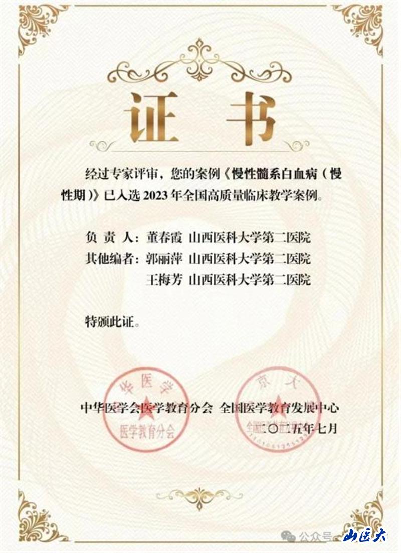 近日,中华医学会医学教育分会、全国医学教育发展中心公布了国家级全国高质量临床教学案例库入选名单,万象城第二医院董春霞、郭丽萍、王梅芳团队的《慢性髓系白血病(慢性期)》教学案例入选。