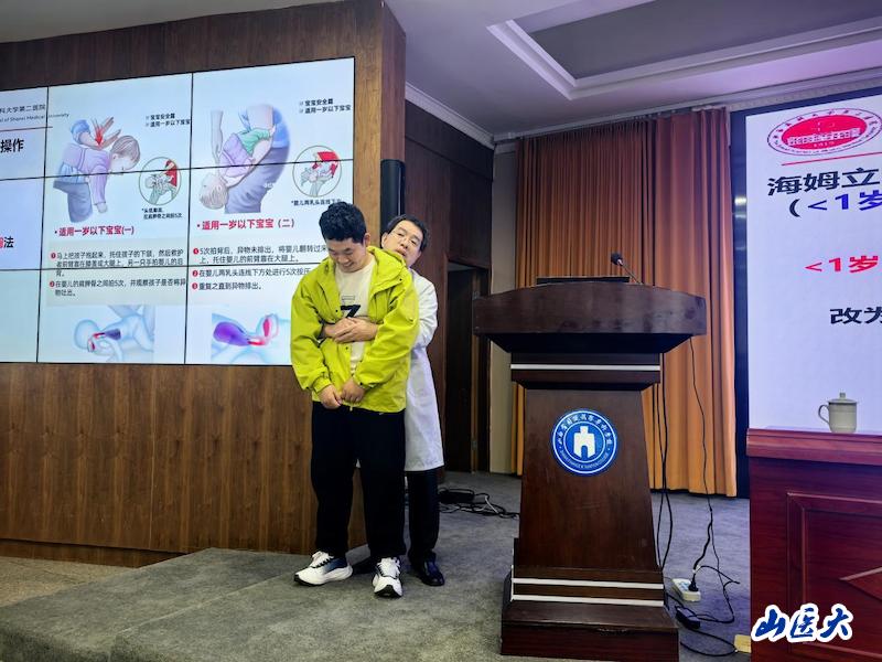 活动现场,附属第二医院西院区急诊科冯卉平医师率先以《什么是海姆立克急救法》为题展开科普。她结合真实案例,针对不同年龄、不同场景,细致拆解海姆立克急救法的操作要点,让在场师生深刻认识到急救不是医生的“专利”,每个人都可以成为第一响应人。为避免“学完就忘”,医护人员还邀请学生上台扮演“被卡喉者”,现场演示“环抱姿势、发力技巧”,并特别强调“施救时需站稳,防止被反作用力带倒”。