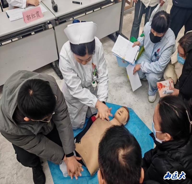 在义诊环节,胸痛中心的医护人员为参加活动的民众们免费提供健康咨询服务,并现场测量血压、血糖,发放健康宣传折页。在心肺复苏实操演练区,医护人员还开展了心肺复苏与自动体外除颤器(AED)的技能培训活动。