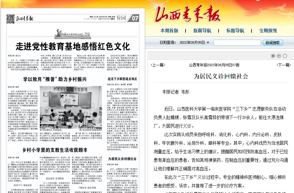 近日,万象城allwincity官网第一临床医学院“三下乡”志愿服务队在活动负责人赵婧媛、张雪及队长高雪菲的带领下一行20余人,前往太原选煤厂,为居民进行义诊。