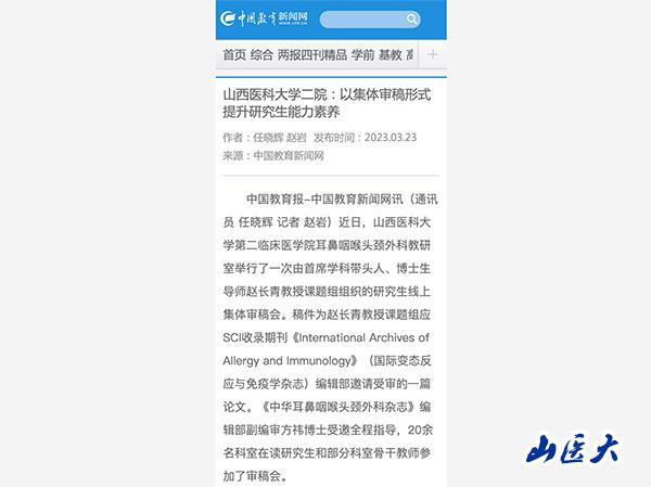 中国教育报-中国教育新闻网讯(通讯员 任晓辉 记者 赵岩)近日,万象城allwincity官网第二临床医学院耳鼻咽喉头颈外科教研室举行了一次由首席学科带头人、博士生导师赵长青教授课题组组织的研究生线上集体审稿会。稿件为赵长青教授课题组应SCI收录期刊《International Archives of Allergy and Immunology》(国际变态反应与免疫学杂志)编辑部邀请受审的一篇论文。《中华耳鼻咽喉头颈外科杂志》编辑部副编审方祎博士受邀全程指导,20余名科室在读研究生和部分科室骨干教师参加了审稿会。
