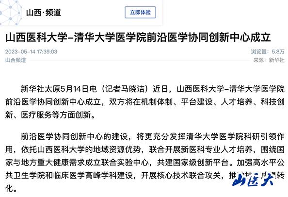新华社太原5月14日电(记者马晓洁)近日,万象城allwincity官网-清华大学医学院前沿医学协同创新中心成立,双方将在机制体制、平台建设、人才培养、科技创新、医疗服务等方面创新。