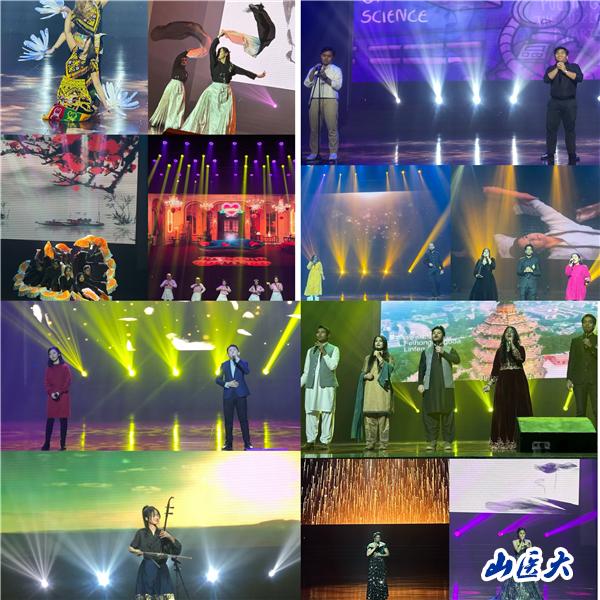 《晋风劲鼓》拉开了全体师生迎接新年的序幕,大气磅礴的锣鼓和青春涌动的气息,表达了全体来华留学生在追求医学梦想的道路上勇攀高峰、勇往直前的信念。巴基斯坦籍留学生演唱歌曲《人说山西好风光》,向观众展示他们对山西的理解与热爱。《欢庆佳节》通过优雅和协调的身体语言展示了印度尼西亚文化的魅力和多样性。《The Scientist》唯美含蓄,《海底》优美深沉,《Chaleya》展现了印巴友谊,国风古韵的歌伴舞《芒种》,由校团委选送的杨子玄同学带来的二胡独奏以其磅礴的气势、热烈的气息、奔放的旋律在多元文化的交流与碰撞中奏响华丽乐章,呈现出兼容并包的文化盛况和视听盛宴。