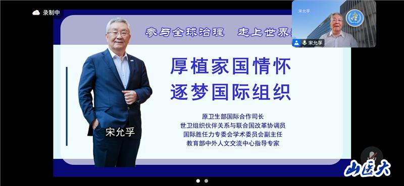 4月11日下午,国际教育学院举办“厚植家国情怀,逐梦国际组织”专题讲座。本次讲座特邀原卫生部外事司司长、世界卫生组织伙伴关系与联合国改革协调员宋允孚担任主讲嘉宾,国际教育学院党总支书记郭亚斌、公共卫生学院党委副书记蔚钰琼、副院长邬惟为出席,国际教育学院副院长张迪主持,200余名师生参与聆听。