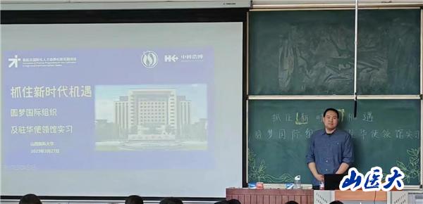 为进一步推进高水平公共卫生学院建设,培养高层次国际化人才,拓展学生全球化视野和国际化思维,3月27日下午,公共卫生学院于中都校区至真楼202室举办了以“抓住新时代机遇 圆梦国际组织及驻华使领馆实习”为主题的高层次国际化人才培养创新实践项目宣讲活动。活动邀请了中科浩博国际教育科技(北京)有限公司高校创新合作部项目主管申志昌、原中国驻墨尔本总领事馆副领事樊博雅主讲,中科浩博国际教育科技(北京)有限公司项目总监李玥琛、公共卫生学院党委书记张志红、国际教育学院副院长于晓霞、国际教育学院项目管理科张迪、公共卫生学院分团委书记张瑾和2022级预防医学专业全体学生参加。