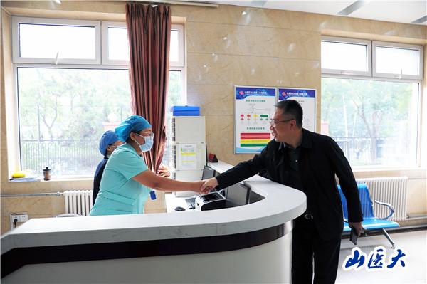 成晓龙一行先后前往院本部急诊、门诊、1号住院楼、2号住院楼、3号住院楼和西院区,看望慰问了医疗、医技科室值班医护人员。所到之处,院领导详细询问科室值班情况、病人收治情况和医疗安全保障措施,深入了解节假日门诊、住院流程和窗口服务情况,深切关心一线医护人员工作和生活中存在的困难和问题。
