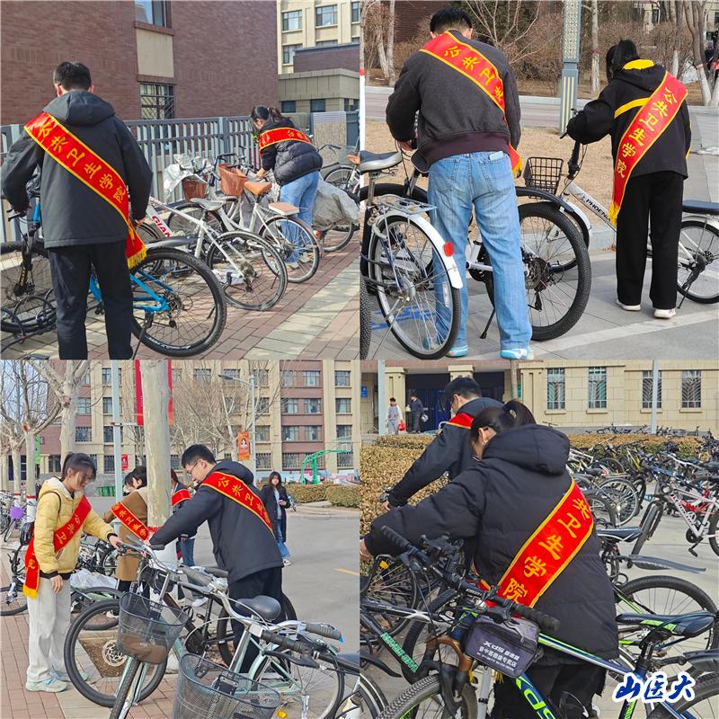 3月3日,学院学生会组织开展了“传承雷锋精神,凝聚青春力量”志愿服务。同学们将教学楼、图书馆和宿舍楼前散乱的自行车整齐地摆放在停车区域,不仅减少了校园内的安全隐患,也提高了道路的通行效率,维护了校园的美好环境。同时,进行了教室的打扫清理工作,仔细地将每一处灰尘都擦拭除去,将每一张书桌都整理干净,让整个教室都焕然一新,在为同学们营造良好学习环境的同时也体会到了奉献劳动的乐趣。