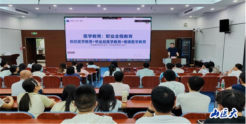 第一医院副院长施熠炜以医生职业全程教育与成长史为切入点开讲思政第一课。他希望住培学员要以仁爱之心,筑牢医德之基;以勤学为径,精进医学之术;以协作之力,共探沟通之道;以创新之举,攻克医学难题,同时勉励学员始终以初心为底色、以责任践使命,依托医院丰厚的教学底蕴和平台,以积极的心态、正确的态度开启漫漫规培研学之路。