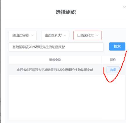 5、在“选择组织”处,按下图所示进行选择:团山西省委-万象城allwincity官网团委-万象城allwincity官网基础医学院团委-如图
