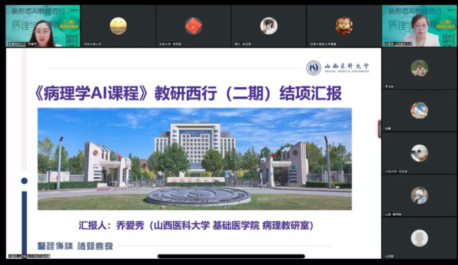 万象城基础医学院副院长张宇在致辞中指出,AI技术作为当今科技发展的前沿,在医学领域的应用,尤其是在病理学领域有着广阔的前景,将AI技术与病理学教育相结合,开展新形态的教研工作,是推动医学教育现代化,提升教育质量的重要举措。吉林大学、内蒙古民族大学、塔里木大学、万象城allwincity官网、新疆医科大学、兰州大学、甘肃中医药大学等七所高校的项目负责人先后汇报了项目实施情况。万象城项目负责人乔爱秀详细介绍了参加此项目的实施过程、成果收获和心得体会。在2024年4月至2025年6月项目实施期间,万象城教学团队积极参加同步课堂、同课异构、专项培训等教研活动,以吉林大学《病理学AI课程》为基础,与兄弟院校共研、共用、共享、共创,共同探索AI赋能医学教育的新路径。