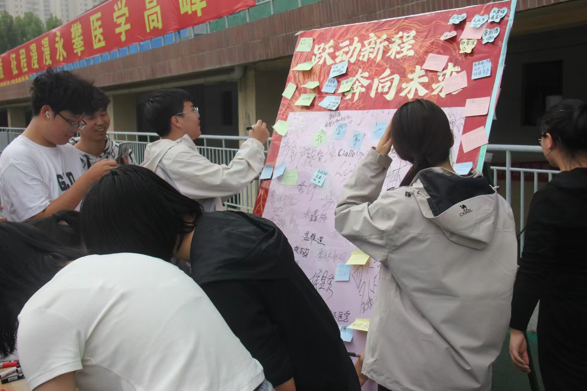 新生们在展板留言,相互勉励尽快适应新环境、奋勇前行,期许自己在新学期坚守初心、笃行不怠,尽显对未来求医之路的坚定与热忱。