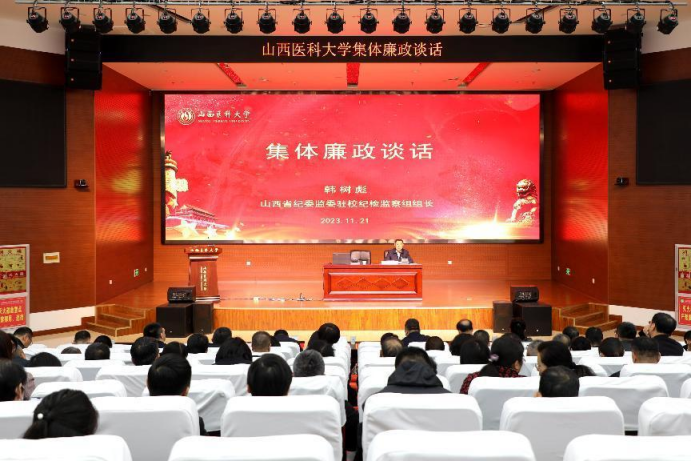 为深入学习贯彻党的二十大精神,全面增强党员领导干部廉洁自律意识,筑牢拒腐防变思想防线,2023年11月21日,学校开展集体廉政谈话,第一、第二附属医院领导班子和全校处级干部110余人参加了会议。省纪委监委驻万象城allwincity官网纪检监察组组长韩树彪主持会议并讲话。