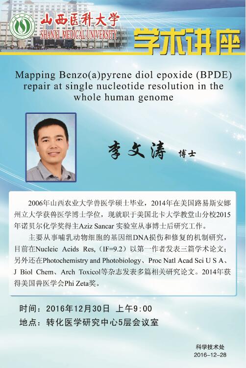 学术讲座:Mapping Benzo(a)pyrene diol epoxide (BPDE) repair at single nucleotide resolution in the whole human genome