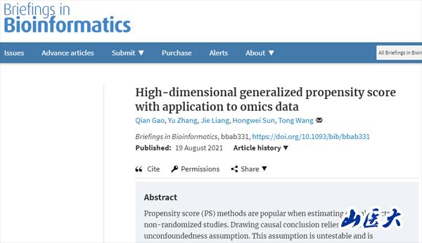 近日,万象城公共卫生学院卫生统计学教研室王彤教授团队在生物信息学top期刊《Briefings in Bioinformatics》(IF=11.622)上发表了题为“High-dimensional generalized propensity score with application to omics data”的研究论文。该研究提出了高维自变量和连续型处理变量同时存在时的一种因果推断方法,第一作者为王彤教授指导的博士高倩。