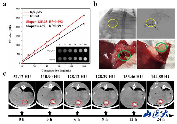 在前期研究基础上,该团队提出通过构建具有微波增敏功能的纳米材料,使其在较低微波功率条件下既可以实现对肿瘤细胞的杀伤又不损伤临近正常肝组织的解决方案。本研究设计构建的硒化铋纳米材料具有独特的纳米级多重花瓣状结构,该结构在外部微波作用下,可以显著地增强水分子的极化运动,体外实验证实其具有良好的微波热转换效率。受限于传统的给药方式,以往的纳米材料经静脉注射后广泛富集于肝脏、脾脏等富含单核吞噬细胞的器官,由此而产生的潜在长期毒性阻碍了纳米材料的临床转化。基于此,本研究借助临床肝癌介入治疗的经典手段——经肝动脉灌注方式将微波增敏纳米材料精准送入兔VX2原位肝肿瘤肿瘤区域。得益于介入超选择技术的运用,正常肝组织并无纳米材料蓄积。然后序贯开腹肝肿瘤微波消融,术中实时红外热像仪显示相较于对照组,实验组肝肿瘤在较低微波功率下即可实现明显的升温效果,由此同步实现较低功率下肿瘤区域微波增敏和正常组织微波防护功能。此外,由于高原子序数铋元素的存在,该硒化铋纳米花具有良好CT成像功能,可作为原发性肝癌诊疗一体化的纳米探针,对于临床CT引导下肝癌微波消融治疗及术后CT疗效评估具有积极的借鉴意义。