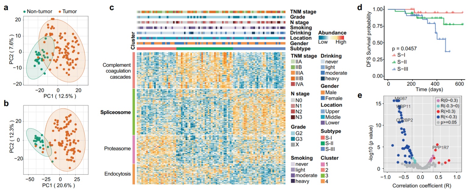 该研究总共鉴定了 9,042 个蛋白质以及 26,892 个磷酸位点。蛋白质组学数据共鉴定了 556 种差异表达蛋白(DEP),包括 227 种上调和 329 种下调蛋白。ESCC的主要特征是剪接体途径和细胞周期途径中蛋白质组学和磷酸蛋白质组学水平升高,并降低ECM-受体相互作用和粘着斑途径。此外,该研究定义了该 ESCC 肿瘤队列中的三种主要蛋白质组亚型(S-I、S-II 和 S-III),并且S-III具有显著最低的无病生存期(DFS)和最大比例的淋巴结转移患者,并且其特征在于剪接体途径中的蛋白质和磷酸化蛋白水平升高。