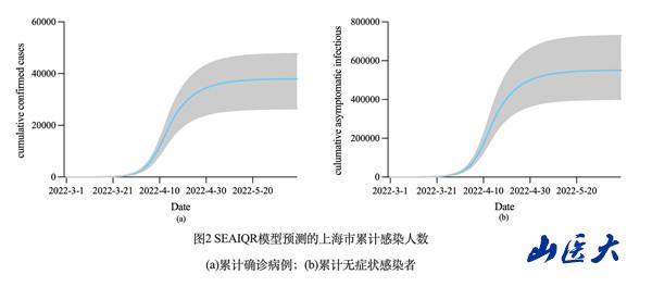 该团队使用2022年3月1日-4月15日上海市疫情数据进行拟合,评估之后7日和14日预测效果。结果表明,上海市每日新增感染人数预计在2022年4月13日到达拐点,尤其是每日新增无症状感染者人数与实际情况高度吻合,拟合优度R2高达0.954,五月中上旬有望实现社会面清零目标(图1)。SEAIQR模型预测的新增确诊病例最终感染规模在26,477~47,749例之间,新增无症状感染者在402,254~730,176例之间(图2),也与上海市疫情的实际情况吻合。通过计算MAPE和RMSPE得出7日和14日数据预测性能均处于较好和合理的范围内,验证了所构建模型对疫情走势评估的可靠性。