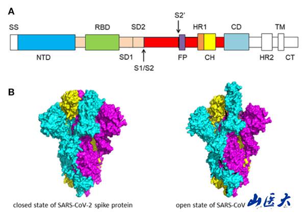 (SARS-CoV-2刺突蛋白的一级结构以及低温电镜结构示意图)