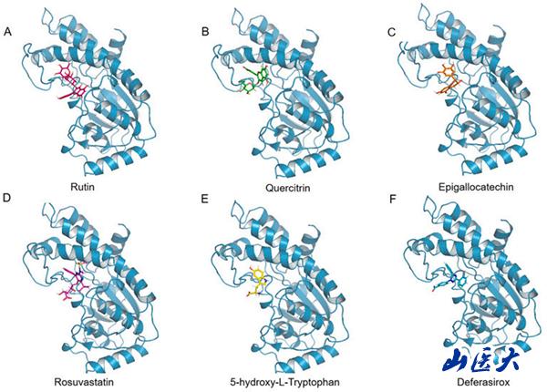 MPXV的E12亚基与6种筛选出的抑制剂的结合模式