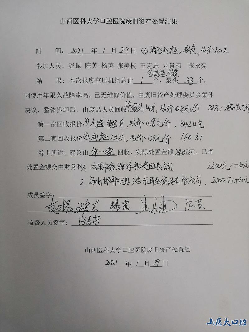 以上两项固定资产的报废请示已于2021年1月28日提交院长会议决议通过,并于1月29日由医院废旧资产管理委员会全体成员组织两家社会回收废旧品单位进行了现场拍卖处置,共拍得现金2400元,已由财务科收讫。