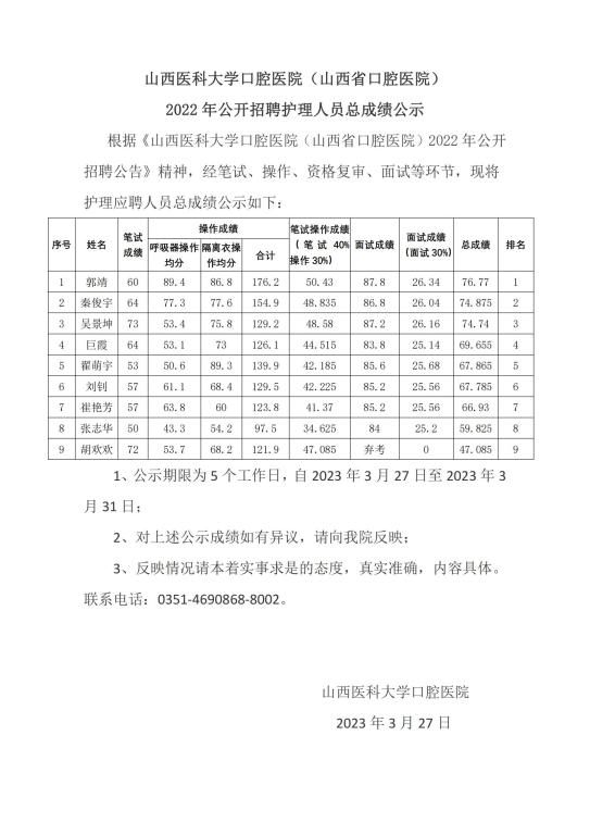 万象城allwincity官网口腔医院(山西省口腔医院)2022年公开招聘护理人员总成绩公示