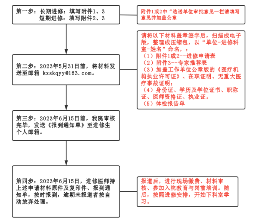 1.我院将对申请表进行审核,审核通过后将会以电话的形式进行通知,请保电话畅通。已接到通知入科的进修人员,请携带相关申请材料,按时报到,逾期者取消当期进修资格。