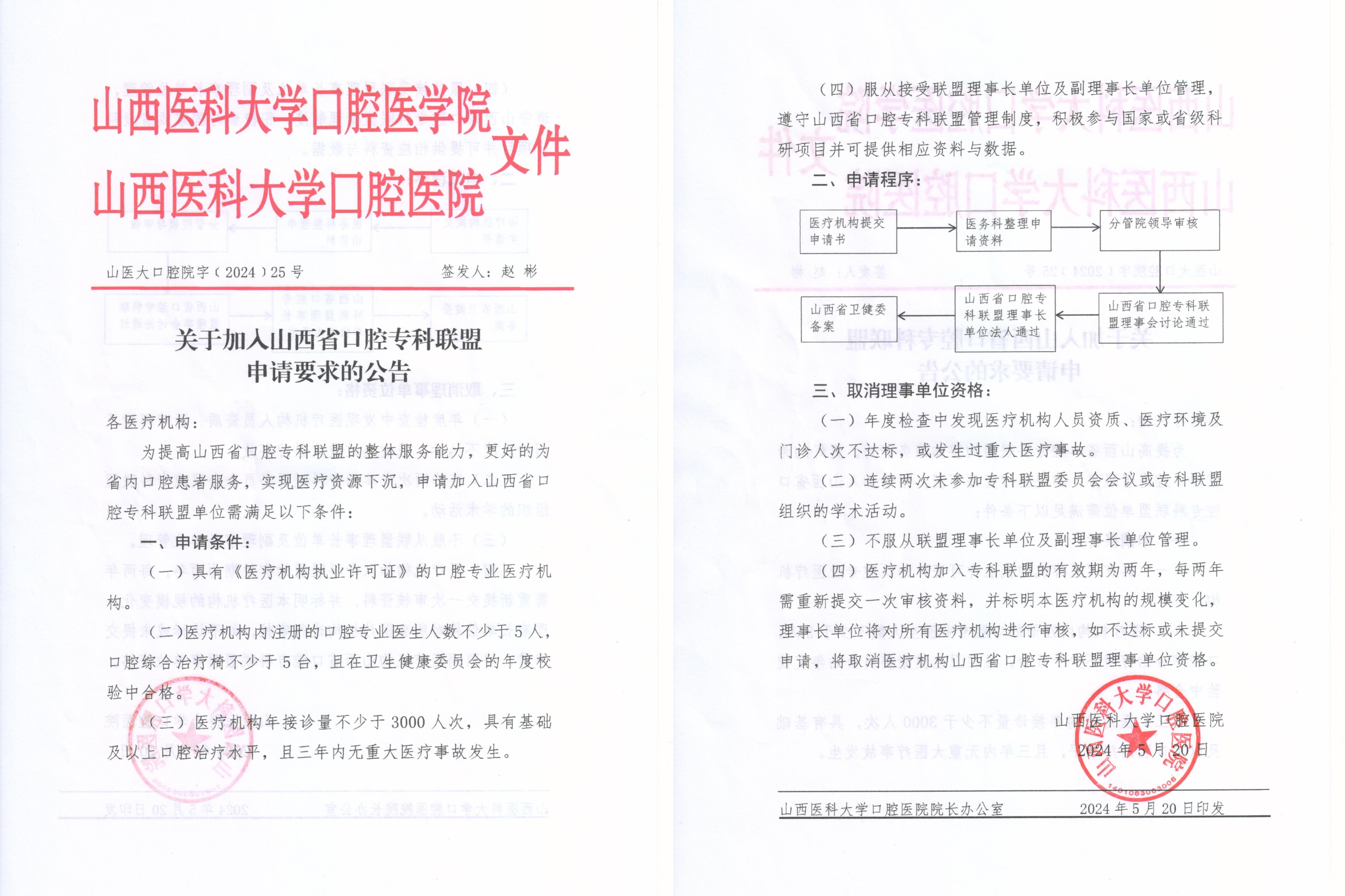 根据山西省卫健委关于《山西省三级医院推进医疗联合体建设实施方案》和《关于成立部分省级专科联盟的通知》的相关政策要求,进一步提高山西省口腔专科联盟的整体服务能力,更好的服务省内口腔患者,实现医疗资源下沉。万象城allwincity官网口腔医院作为山西省口腔专科联盟(以下简称“联盟”)理事长单位,为保障联盟的有序管理和规范运作,制定申请加入联盟的相关要求。现公告如下: