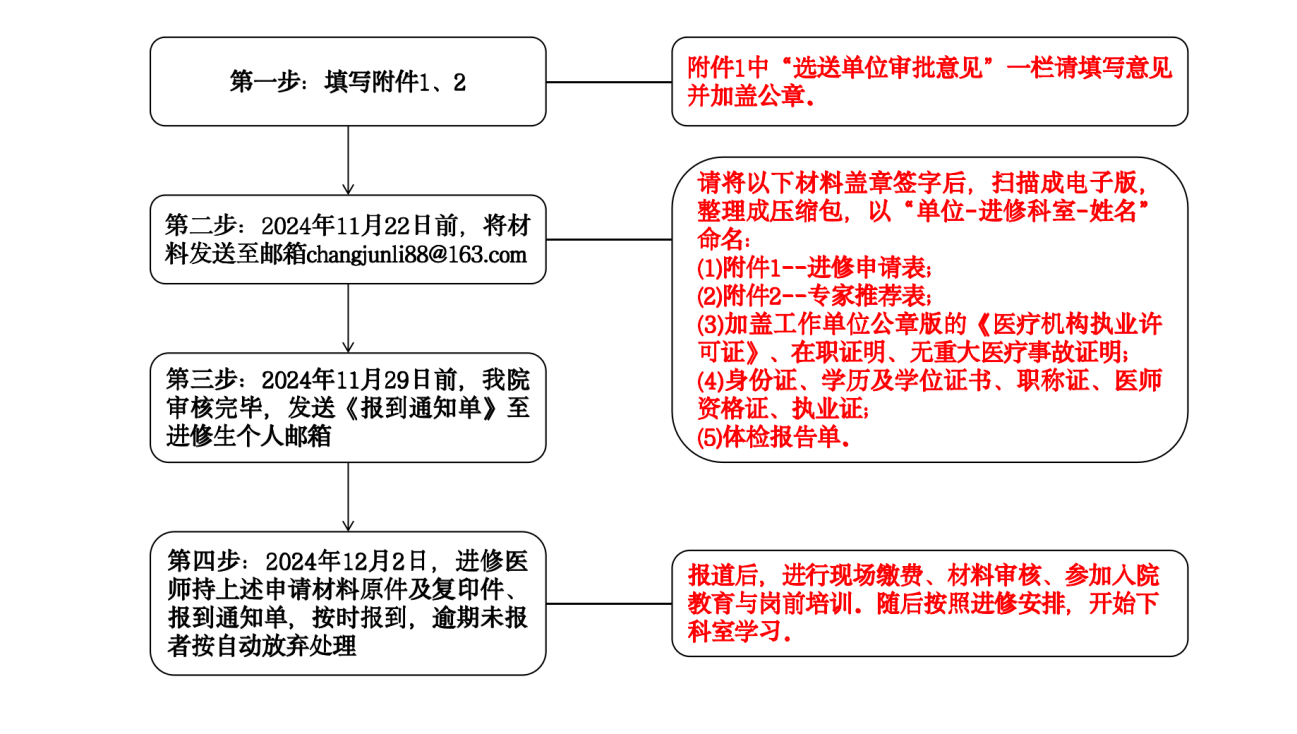 1.我院将对申请表进行审核,审核通过后将会以电话的形式进行通知,请保持电话畅通。已接到通知入科的进修人员,请携带相关申请材料,按时报到,逾期者取消当期进修资格。