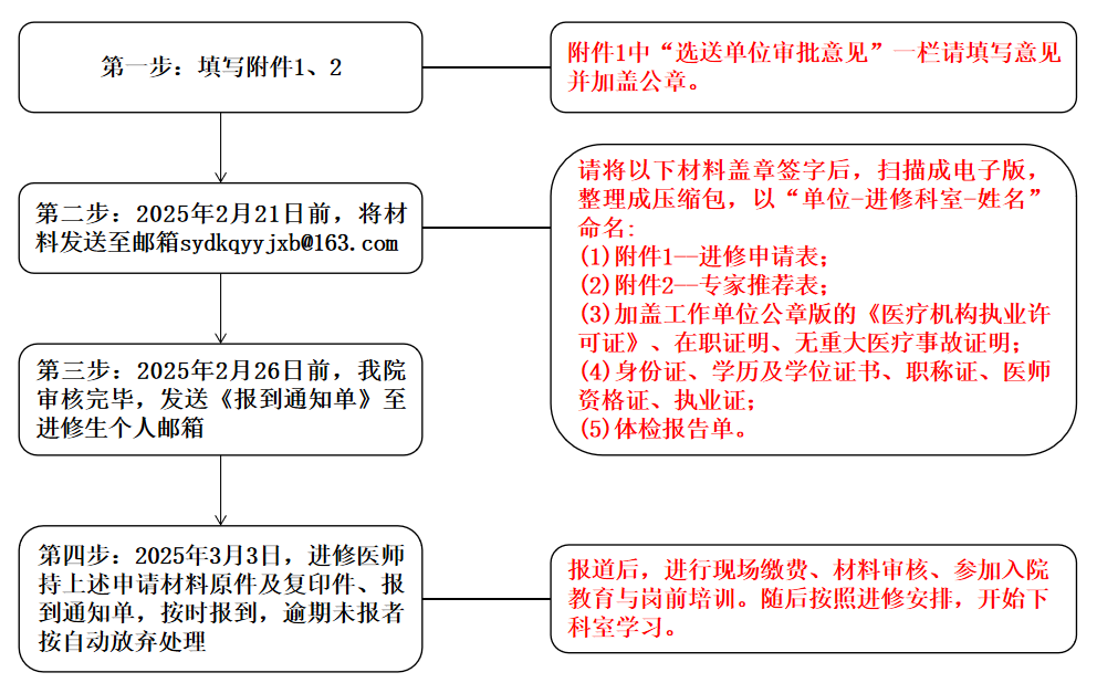 1.我院将对申请表进行审核,审核通过后将会以电话的形式进行通知,请保持电话畅通。已接到通知入科的进修人员,请携带相关申请材料,按时报到,逾期者取消当期进修资格。