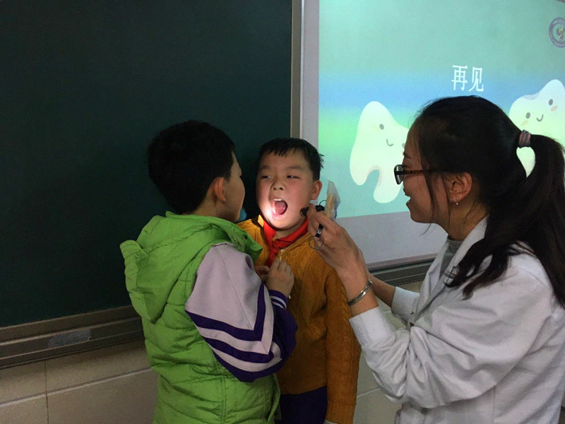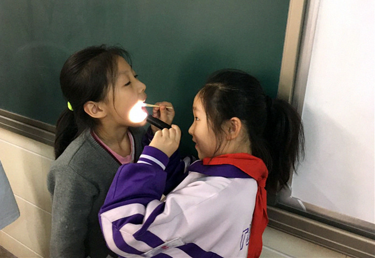本次活动在该校的组织配合下展开,我院医务人员通过有趣的护齿教学课件,为孩子们讲解了有关健康牙齿的保护、龋齿的形成及症状、如何刷牙更科学等相关知识。同时通过“角色体验”的模式,让每个孩子化身成为小小牙医,用学到的口腔保健知识帮助自己的小伙伴检查有无龋齿,并模拟刷牙流程,充分调动了大家参与的积极性。活动现场气氛活跃融洽,通过寓教于乐的宣传教育形式,帮助孩子们掌握了一些口腔保健的小方法,为他们树立起“爱护牙齿从小做起”的健康观念。