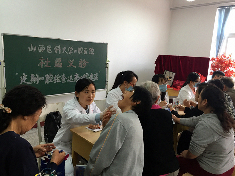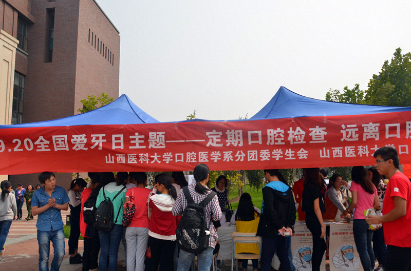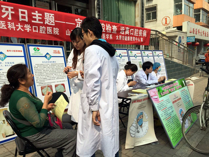 在此期间,医院在院内、院外开展了多种形式的义诊宣传教育活动。口腔系分团委、学生会在新校区举办爱牙日宣教活动,通过签名、讲座等多种形式,为在校师生进行了牙病防治知识的普及教育,提供了口腔检查和口腔保健知识咨询服务,并发放了护牙手册和口腔保护用品等,受到大家的广泛好评。同时医院还与太原市健康教育中心配合,组织口腔专业医师深入太原市尖草坪区翠馨苑社区进行义诊宣传活动,开展口腔健康检查,牙齿保健宣传等,同时还免费为社区居民发放宣传册、折页及牙膏等小礼品,共接待群众100余人。