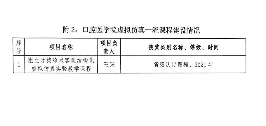 我院始终深入贯彻落实《教育部关于一流本科课程建设的实施意见》,不断加强一流课程建设培训辅导,力推线上线下混合式教学改革,积极促进信息技术与教育教学的深度融合,全面提高教育教学质量。在全院教师不懈努力下,逐步形成了1门国家级一流课程领衔,7门省级一流课程助力,9门校级一流课程建设支撑,全面覆盖口腔医学主干课程的全精品课程体系。目前《口腔修复学》《口腔正畸学》正在冲击国家级一流课程。