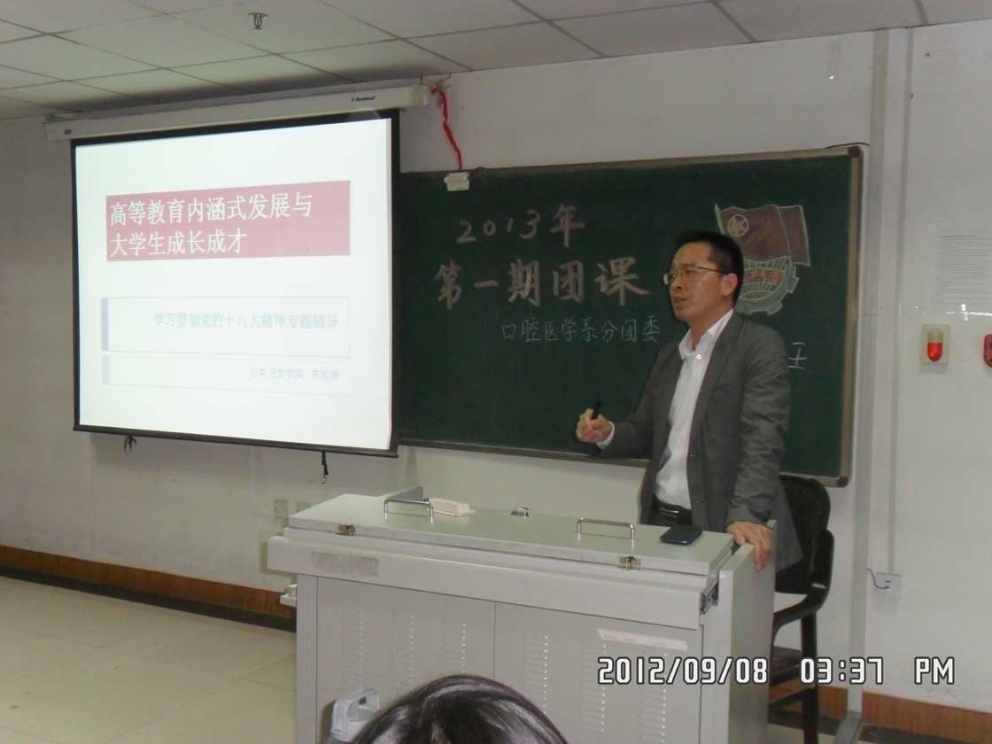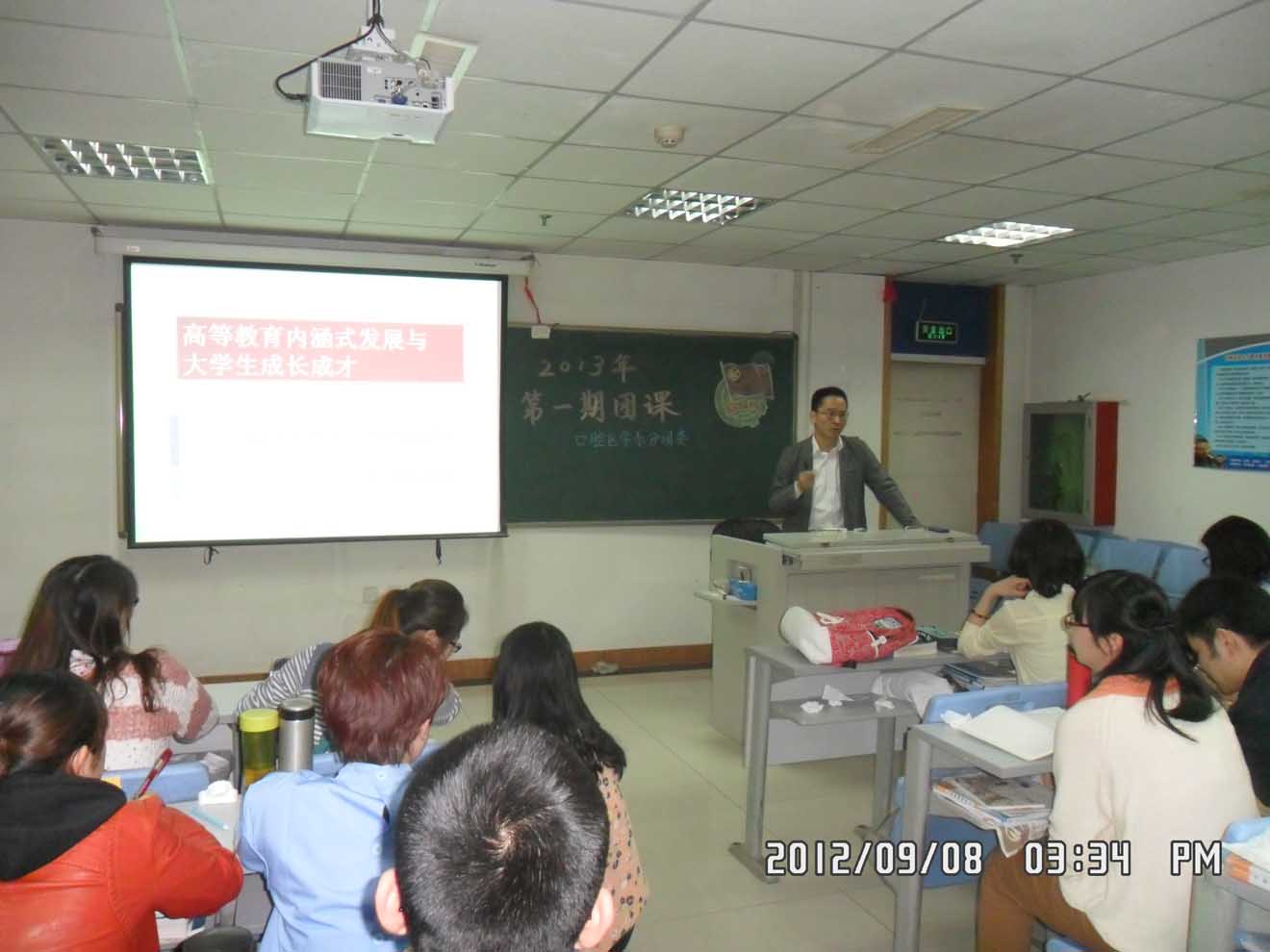 口腔医学系、口腔医院分团委于4月15—18日举办了本年度第一期团课教育活动。本次团课邀请了万象城公共卫生学院书记苏天照和口腔医学系副书记殷凤主讲。口腔医学系教工、部分党员、学生入党积极分子及学生会干部50余人参加了此次学习。
