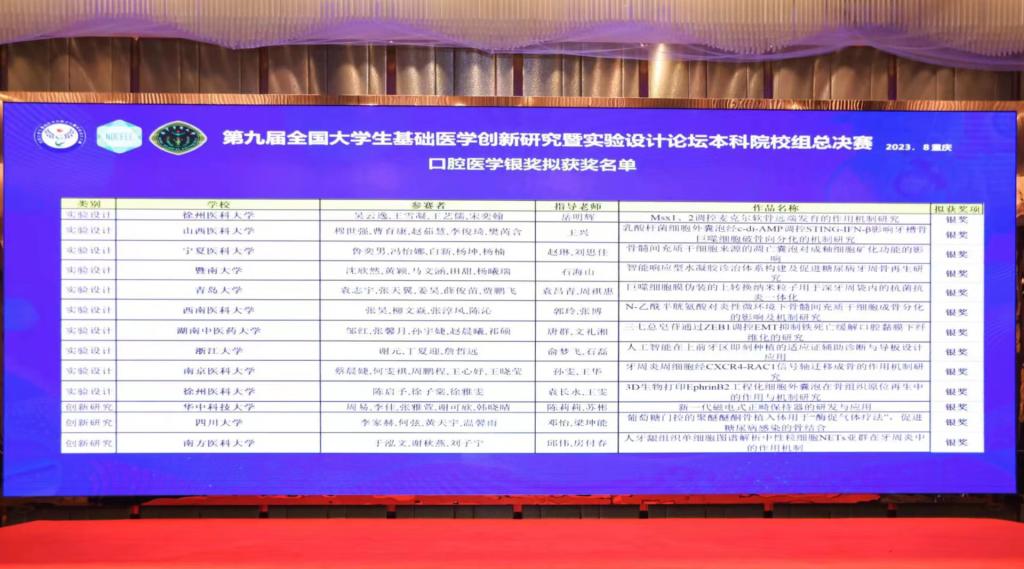 第九届全国大学生基础医学创新研究暨实验设计论坛决赛于2023年8月25日在陆军军医大学拉开帷幕,34个本科生团队展开角逐,经过激烈竞争后,我院王兴教授指导参赛团队完成的项目《乳酸杆菌细胞外囊泡经 c-di-AMP 调控 STING-IFN-β影响牙槽骨巨噬细胞破骨向分化的机制研究》荣获银奖。