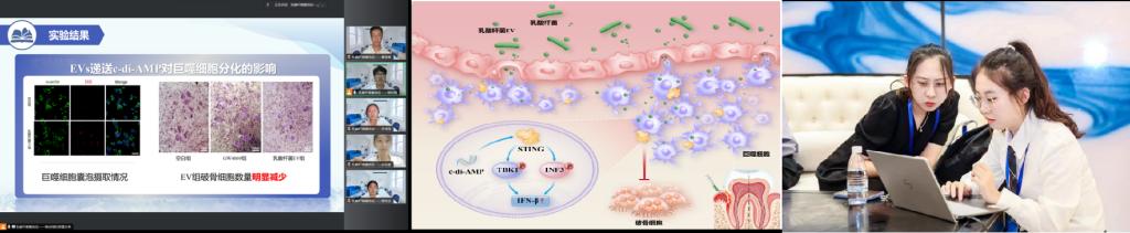 我院参赛作品《乳酸杆菌细胞外囊泡经c-di-AMP 调控 STING-IFN-β影响牙槽骨巨噬细胞破骨向分化的机制研究》项目创新性地探讨了一种针对牙周炎导致的牙槽骨吸收的新型治疗方式:乳酸杆菌释放的细胞外囊泡内含环二腺苷酸可跨物种激活人巨噬细胞表面干扰素基因刺激因子从而调控巨噬细胞破骨向分化治疗其导致的牙槽骨吸收,同时避免乳酸杆菌的产酸致龋作用。团队成员从牙周炎导致的牙槽骨吸收入手,并深入探究其发生发展机制,提出了乳酸杆菌囊泡抑制牙槽骨吸收的治疗途径,实验设计中,团队成员依托于重点实验室和临床研究中心,熟练掌握了相关实验途径与实验方法,具有理论与人员安排可行性。在实验完善实施方面,团队成员多学科交叉互补,专创融合,层层深入,交叉验证为牙周炎牙槽骨吸收的临床治疗拓展新的视角。
