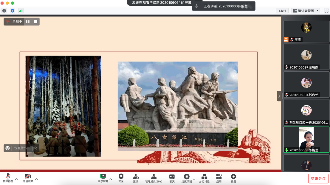 会上,黑龙江籍学生刘昱彤首先带领大家重温了“九·一八”事件的时代背景,并为同学揭露了日军使用栽赃嫁祸等卑劣手段侵占中国的狼子野心。吉林籍学生陈婉莹和黑龙江籍学生毕译新采用线上巡游的方式,带领大家走进坐落于辽宁省沈阳市的“九·一八”事变纪念馆,通过讲解纪念馆前的警钟,告诫大家警钟长鸣,勿忘国耻,并通过残历碑、砍刀、尸骨累累的坟冢雕塑等展品,向大家展示日军侵华的累累罪证。黑龙江籍学生胡毅针对战争的经过以及对部分历史人物进行了重点讲述,让同学们对战争的历史真相有了更深刻的了解。最后,王竞结合自己在东北地区多个与日军侵华相关的博物馆和历史纪念馆的学习经历,向同学们表达了要主动学习历史、研究历史、铭记历史的殷切期盼。