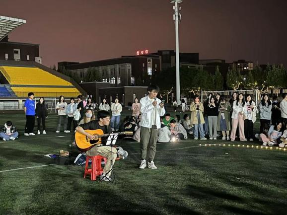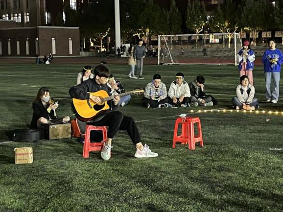 傅雨兴同学的《我好想你》、郝梓竹同学的《后来》、吴桐同学的《My heart will go on》,21级口腔学弟郁永乐的《画》和《雪》,以及十几名同学的歌曲大串烧,都让大家感受到音乐的热情和浪漫。辅导员王竞,以及刘树和韩文泽两位同学,也受到热情的召唤,即兴演唱了《开不了口》和《男孩》两首歌曲。欢快的氛围同样感染着其他院系的同学,一名17级返校接受继续教育的麻醉学长也即兴用吉他自弹自唱了《爱人就错过》,他说,以前在学校只知道学习,没想到口腔医学院的氛围这么好,忍不住想和大家分享音乐。最后,21级口腔学弟屈鑫钰也即兴拿起了吉他,伴奏了一曲《晴天》,在唱到歌词“但故事的最后,你好像还是说了拜拜”,这场晚会也正式和大家说了再见。