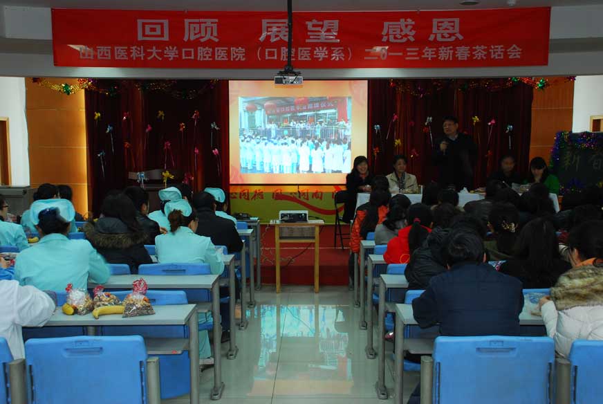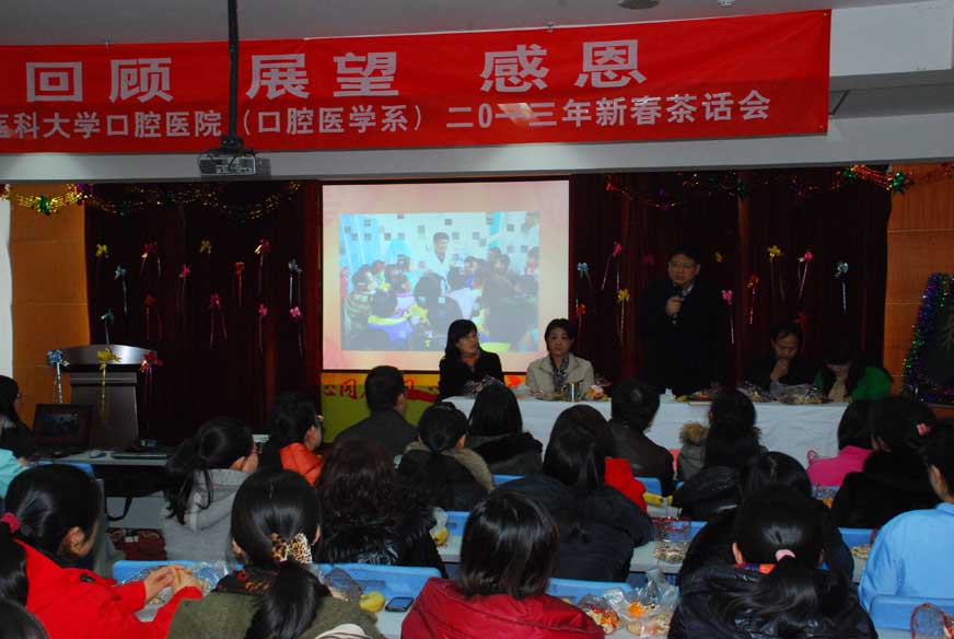 2月1日17:00在万象城allwincity官网口腔医院八层教室,伴随着欢快的新年祝福的歌曲,万象城allwincity官网口腔医学系、口腔医院2013新春茶话会拉开了帷幕。口腔医学系、口腔医院领导班子和全院职工160余人参加了茶话会。茶话会俭朴、简约而精致,改变了以往职工集体聚餐;会议鲜花、气球及糖果等的繁琐会务布置,弘扬了艰苦奋斗、勤俭节约的优良作风,贯彻落实了中央政治局关于改进工作作风的要求。